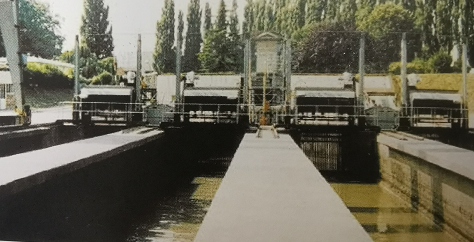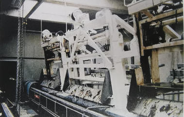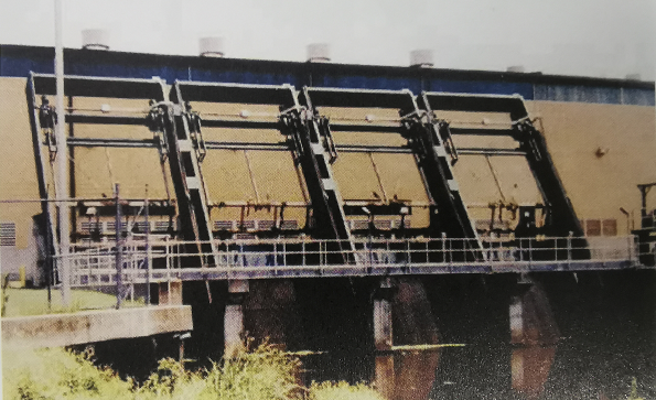 圖4 Algiers泵站(美國新奧爾良):四臺5.5m寬、6.1m深的Climber格柵 當需要處理流量很大(大于30000m/h)并且雜質較少(如地表水取水)的來水時,可以采用移動式柵耙進行清理,它每次只清理一部分格柵面,并在清理完成后橫向移動。 c.回轉式格棚 這種間隙為3~15mm的格柵系統采用了連續鏈條柵架,這些具有特殊鉤形的耙齒,通過串接軸連接形成環形格柵簾,柵渣被提送到頂部,然后在背面自行掉落。 耙齒由連接臂(鏈節)和鉤形端頭組成。鉤形端頭錯位推移離開耙齒,從而清理出柵渣,隨后由一個轉刷完成自動清理過程。 d.階梯格柵 柵條間隙為3~15mm,格柵篩架由兩組平行的柵片組成,一組為靜片,一組為動片,兩組柵片交替排列裝配成階梯形。 由一組鉸鏈臂驅動移動柵片進行轉動,逐級將柵渣向上提升,直至到達頂部排渣位置。 ②后清式(背耙式)格柵 某些格柵的清渣系統采用設在柵架背面的循環鏈條。雖然存在柵渣掉入下游水體中的風險,但是這種格柵可以用作對清渣能力要求很高的初級格柵(圖5),能夠處理柵渣量很大的原水.
