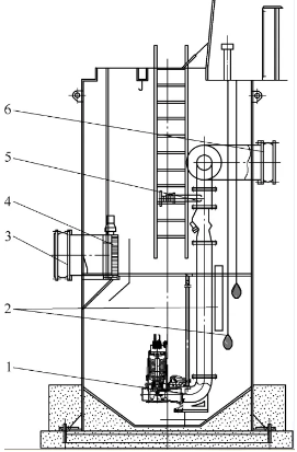 1—水泵及底部2—液位變送器3—出口管4—格柵設備5—閘閥6—出入口管