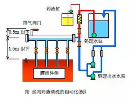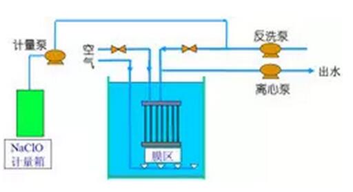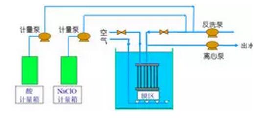 有機物污染通過堿洗效果明顯、鹽結(jié)垢通過酸洗效果明顯的原理,將化學(xué)加強反洗程序引入到MBR膜的運行過程中。通過類似于低強度的化學(xué)清洗的操作,將MBR膜的污染消除在剛形成的階段,阻止膜污染得不到及時恢復(fù)形成協(xié)同惡化的效應(yīng)。