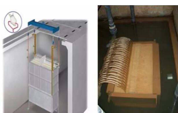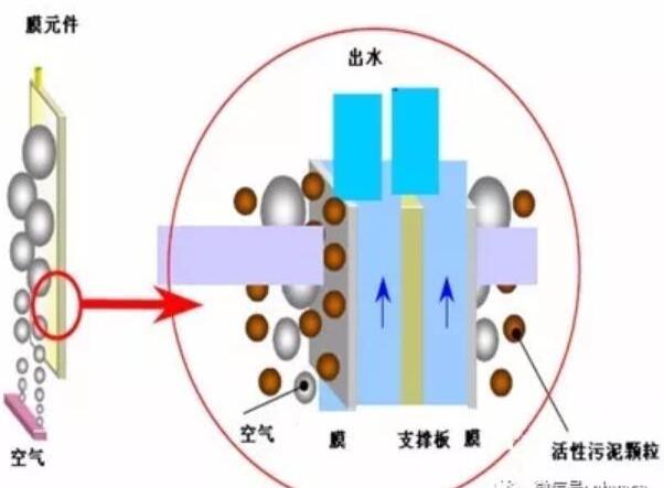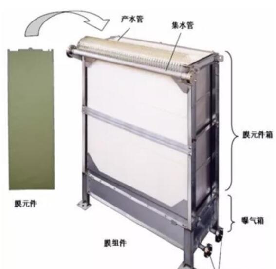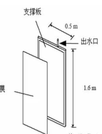 緊湊合理的污水處理系統 MBR可以在高濃度的活性污泥(7000~18000mg/L)條件下,仍可以進行生物反應。也就是說,在MBR中,含有更多有機組分的污水在短時間內或在更小的空間內可以被分解,生物反應速度較快。他不僅可以降解BOD等有機物,還具有硝化除氮的功能。而且在MBR中,不需要二沉池。因此相比傳統的活性污泥法來說,安裝MBR空間要小得多。它可以適用于既有設備的擴容改造,也可以減少新建設備的占地面積。 高質量的處理水質 膜分離不可能像沉降分離那樣發生懸浮物泄漏的問題,而且一些微生物如大腸桿菌,隱孢子蟲等均可被微濾膜除去。 設計采用日本原裝MBR膜組件: 浸沒式膜組件包含曝氣箱和膜元件箱組成。膜元件箱裝有一定數量的按一定的間隔裝填的膜元件,每片膜元件是在支持板的兩面貼上平板膜而形成的。曝氣箱體包括了提供空氣的曝氣管。(如圖(4)—1)
