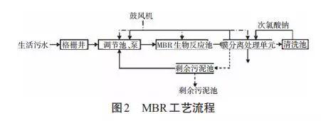 MBR主體工藝 工藝原理 膜生物反應器(Membrane Biore-actor,簡稱MBR)技術是膜分離技術和活性污泥法相結合的工藝。與活性污泥法有所不同,其不需要利用沉淀池實現固液分離,而是借助中空纖維膜替代沉淀池,因此其固液分離能力更加突出。 MBR工藝特點 MBR處理工藝能適應各種水質,并且具有良好的沖擊負荷能力。處理池中采用新型彈性立體填料,比表面積較大,更容易實現微生物掛膜及脫膜,在相同的有機物負荷條件下,其去除有機物的效果更加明顯,能提高空氣中的氧在水中的溶解度;其工藝簡單,不需要設置過濾池、沉淀池,可有效節約土地資源;同時,可有效減少水力的停留時間,減少污泥排放量,進而降低污泥處理成本。 MBR工藝流程 如圖 2 所示,污水經格柵井流入調節池后經提升泵進入生物反應池,借助PLC控制器開啟鼓風機進行充氧作業,生物反應池出水經循環泵進入膜分離處理環節,污水返回調節池。反沖洗泵借助清水池中的處理水達到反沖洗膜處理設備的目的,同時反沖污水返回調節池。提升泵開啟與閉合由反應池的水位進行控制。膜單元的過濾操作與反沖洗操作,能通過手動與自動兩種控制方式實現。