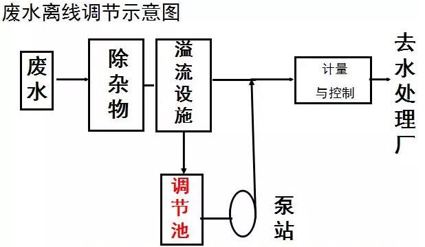 離線調節則是只有超過處理設計流量的那一部分流量才進人調節池,對廢水組分和流量的變化僅起輕 微的緩沖作用,但節省能源。